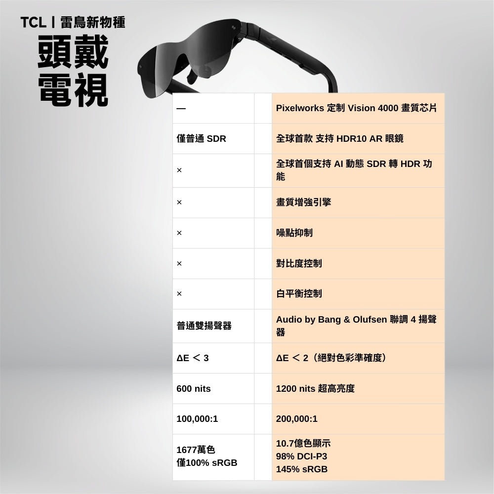 ● 全球首款支援 HDR10 的 AR 眼鏡:高動態範圍顯示,亮部更亮、暗部更深,畫面層次更接近電影院級體驗。